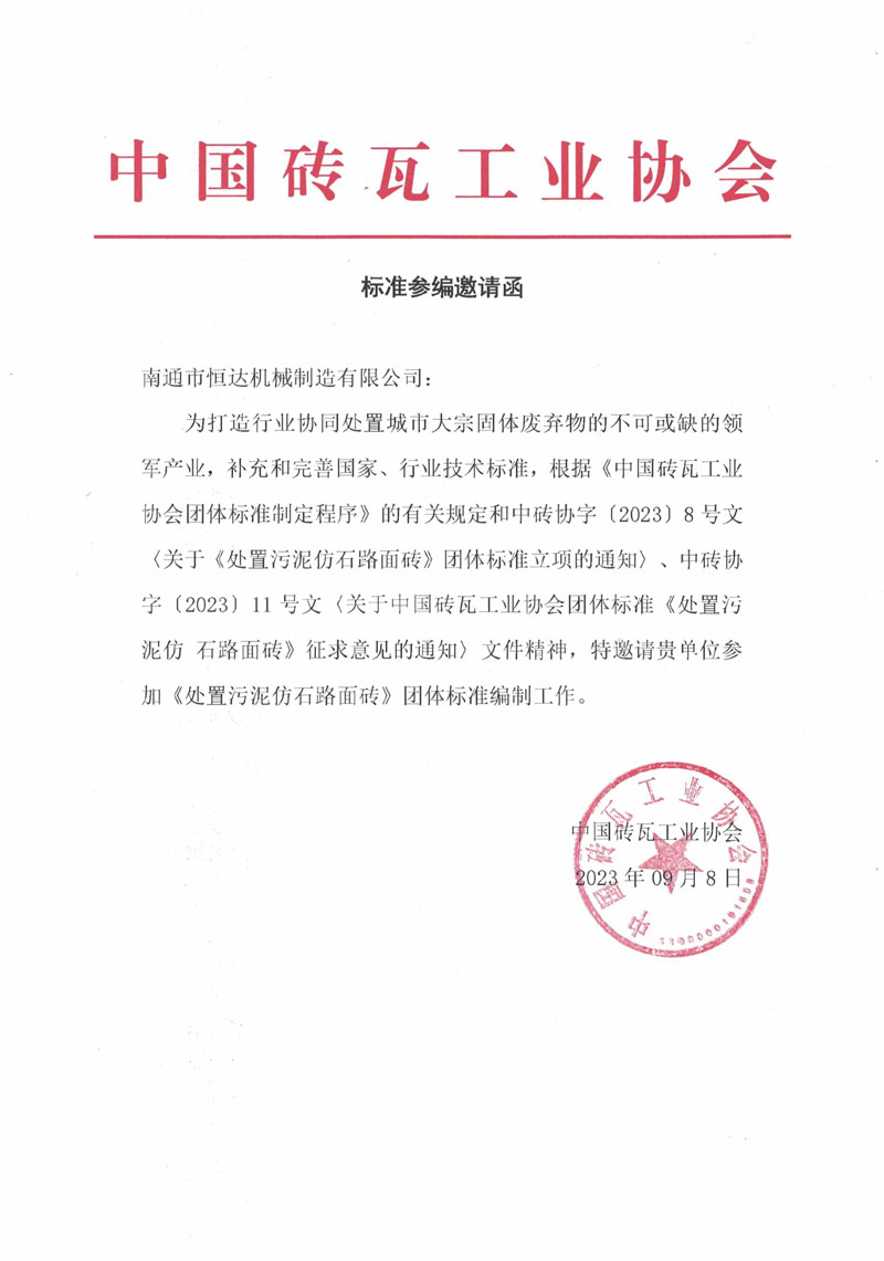 行業(yè)要健康發(fā)展,標(biāo)準(zhǔn)必須先行。再此背景下,2023年10月21-22日,在中國杭州,中國磚瓦協(xié)會及時的組織了行業(yè)骨干企業(yè),群策群力,制定高質(zhì)量標(biāo)準(zhǔn)。南通市恒達機械制造有限公司董事長崔恒全和技術(shù)總工于銀龍受邀請參加,為標(biāo)注的制定貢獻恒達力量。